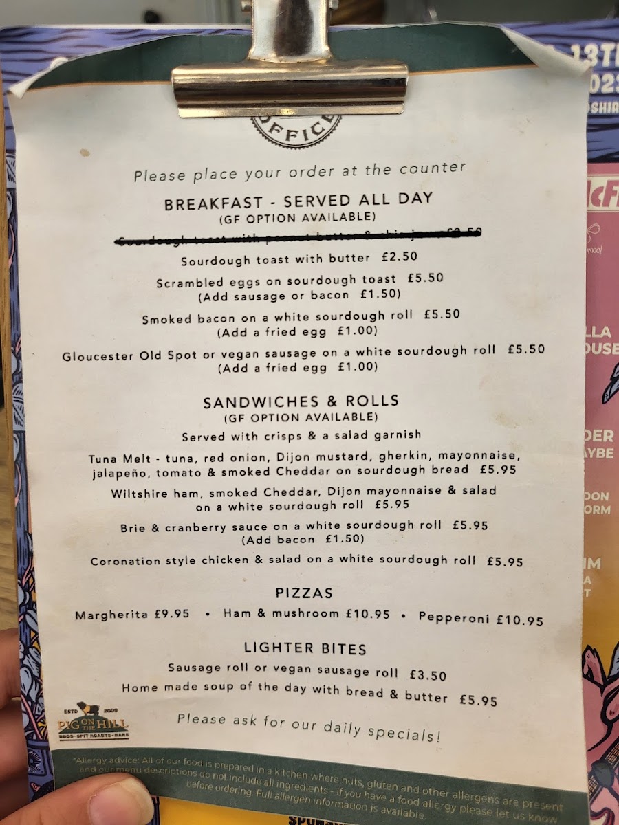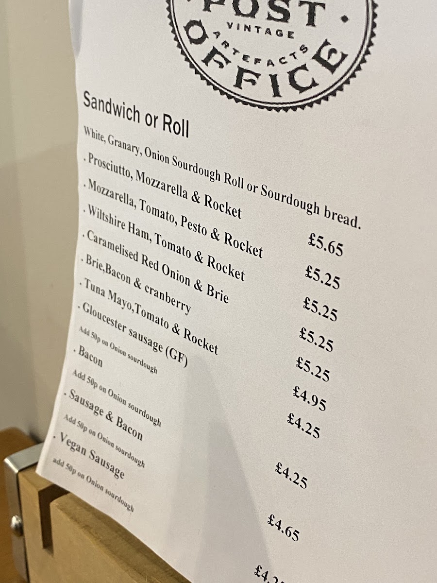 The menu at The Old Post Office Shop impresses with its blend of hearty sandwiches and indulgent cakes, each thoughtfully crafted and inviting. For a savory bite, options like the Prosciutto and Mozzarella on Rosemary Focaccia and the Mozzarella and Pesto on Focaccia with vine ripened tomatoes showcase fresh, high-quality ingredients, while the Gloucester Sausage Sandwich and Locally Sourced Bacon Sandwich offer classic comfort flavors. Those seeking a snack or a lighter treat will appreciate the Homemade Gloucester Sausage Roll, perfectly balancing flaky pastry and savory filling. On the sweeter side, the bakery selection is equally compelling: the Chai Spiced Cake and the Orange, Almond and Polenta Cake (GF) provide a sophisticated, fragrant twist on traditional flavors, while the Carrot and Cardamom Cake delights with its warm spice. For something a little more decadent, the Custard Cruffin and Swedish Raspberry and Custard Bun are standout choices, combining luscious custard with tender pastry in every bite. Overall, the menu at The Old Post Office Shop demonstrates a careful attention to flavor and presentation, offering both familiar favorites and inventive treats that make a visit rewarding for any palate.